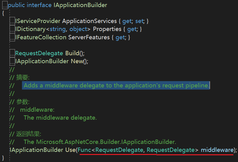 在應用程序代碼中,我們可以從用于注冊中間件的Use方法中看出,所謂管道中的中間件其實就是一種委托類型的對象,這個具體的委托對象體現為“Fun<RequestDelegate,RequestDelegate>”。