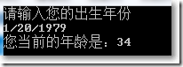 class Program {static void Main(string[] args){ try {Console.WriteLine("請輸入您的出生年份");DateTime d = Convert.ToDateTime(Console.ReadLine());DateTime dateInstance = new DateTime();int age = dateInstance.Age(d);Console.WriteLine("您當前的年齡是:{0}", age);Console.ReadKey(); } catch (Exception ex) {Console.WriteLine(ex.Message); }} }