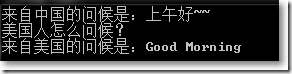 class Program {static void Main(string[] args){ DisplayMessage displayMessage = new DisplayMessage(); displayMessage.SetTime(); Console.WriteLine("來自中國的問候是:{0}", displayMessage.GetMsg()); Console.WriteLine("美國人怎么問候?"); Console.WriteLine("來自美國的問候是:{0}", displayMessage.GetLocalMsg("USA")); Console.ReadKey();} }