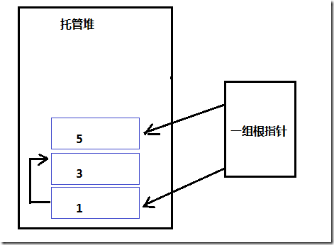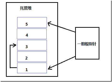 以上,假設(shè)托管堆中有5個(gè)對(duì)象,1和5被跟指針引用,3依賴1,那么在這組托管堆對(duì)象中,2和4被回收后變成如下:
