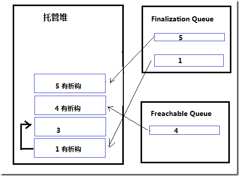 對(duì)于那些不被任何其它對(duì)象所引用,如果沒(méi)有析構(gòu)函數(shù),比如2,將被直接回收,如果有析構(gòu)函數(shù),例如4,會(huì)被放到"Freachable Queue"中,等待GC實(shí)施下一輪回收。