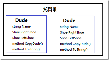拷貝后,2個Dude的Shoe類型的屬性指向了同一個托管堆內的Shoe實例,改變Shoe的值會同時影響到2個Dude。