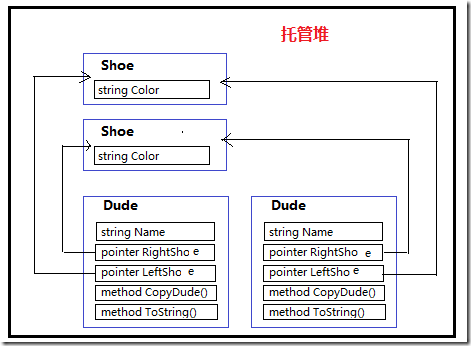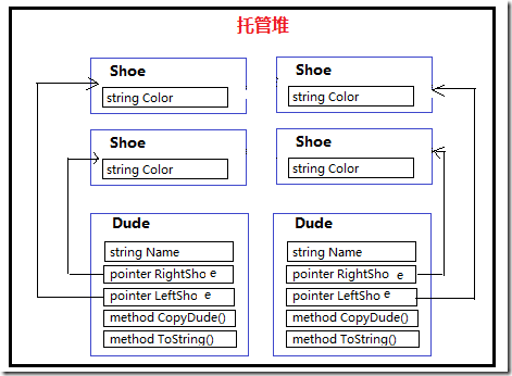 當Dude類包含引用類型屬性Shoe的時候,在托管堆上的情況是這樣的: