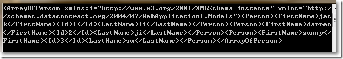 public class PersonController : ApiController {public IEnumerable<Person> GetAllPersons(){ return new List<Person> {new Person(){Id = 1, FirstName = "jack", LastName = "li"},new Person(){Id = 2, FirstName = "darren", LastName = "ji"},new Person(){Id = 3, FirstName = "sunny", LastName = "su"} };} }在瀏覽器中輸入: