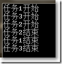static void Main(string[] args){ var t1 = Task.Factory.StartNew(() => DoSth(1, 2000)).ContinueWith((pre)=> DoOtherThing(4,2000)); var t2 = Task.Factory.StartNew(() => DoSth(2, 1500)); var t3 = Task.Factory.StartNew(() => DoSth(3, 3000)); Console.ReadKey();}static void DoSth(int id, int sleepTime){ Console.WriteLine("任務{0}開始",id); Thread.Sleep(sleepTime); Console.WriteLine("任務{0}結束",id);}static void DoOtherThing(int id, int sleepTime){ Console.WriteLine("其他任務{0}開始", id); Thread.Sleep(sleepTime); Console.WriteLine("其他任務{0}結束", id);}如果希望等待所有的Task執行完畢,使用WaitAll方法。