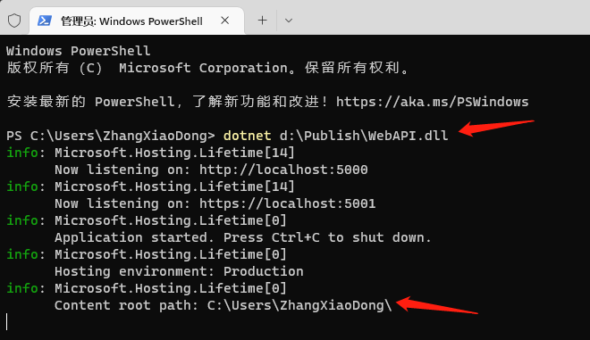 只要在原本的啟動命令dotnet d:\Publish\WebAPI.dll 優化為dotnet d:\Publish\WebAPI.dll --cd='true' 即可,從上圖可以看出雖然我們的啟動命令還是在c:\User\ZhangXiaoDong 目錄執行的,但是程序的運行目錄已經被重定向到了dotnet d:\Publish\ 這個路徑也正是我們的程序所在路徑。