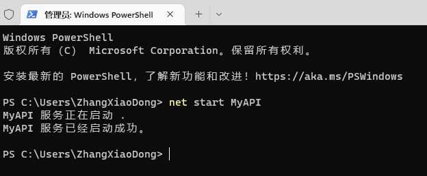 安裝成功之后控制臺會輸出[SC] CreateService 成功 ,其中MyAPI 時我們創建服務時指定的服務名稱,binpath 即是我們的程序路徑,注意 true 是 用英文狀態的雙引號包裹,然后整個 binpath 采用因為狀態的 單引號包裹,start= auto 則表示將我們的 MyAPI 服務設置為自動啟動。
