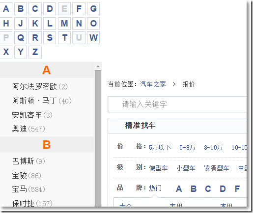 品牌上方的字母歸類,比如奧迪上方的字母A,實(shí)際上是一個(gè)div。