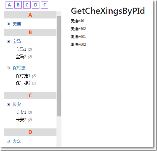 public class Database {public static IEnumerable<CarCategory> GetAllCarCategories(){ return new List<CarCategory> {new CarCategory(){Id = 1, ParentId = 0, Name = "奧迪",FirstLetter = "A", AnchorName = "AA", Level = 1, DelFlag = 0},new CarCategory(){Id = 2, ParentId = 0, Name = "寶馬",FirstLetter = "B", AnchorName = "BB", Level = 1, DelFlag = 0},new CarCategory(){Id = 3, ParentId = 0, Name = "保時(shí)捷",FirstLetter = "B", AnchorName = "BB", Level = 1, DelFlag = 0},new CarCategory(){Id = 4, ParentId = 0, Name = "長(zhǎng)安",FirstLetter = "C", AnchorName = "CC", Level = 1, DelFlag = 0},new CarCategory(){Id = 5, ParentId = 0, Name = "大眾",FirstLetter = "D", AnchorName = "DD", Level = 1, DelFlag = 0},new CarCategory(){Id = 6, ParentId = 0, Name = "東風(fēng)",FirstLetter = "D", AnchorName = "DD", Level = 1, DelFlag = 0},new CarCategory(){Id = 7, ParentId = 0, Name = "豐田",FirstLetter = "F", AnchorName = "FF", Level = 1, DelFlag = 0},new CarCategory(){Id = 8, ParentId = 0, Name = "福特",FirstLetter = "F", AnchorName = "FF", Level = 1, DelFlag = 0},new CarCategory(){Id = 9, ParentId = 1, Name = "奧迪A4",FirstLetter = "A", AnchorName = "AA", Level = 2, DelFlag = 0},new CarCategory(){Id = 10, ParentId = 1, Name = "奧迪A6",FirstLetter = "A", AnchorName = "AA", Level = 2, DelFlag = 0},new CarCategory(){Id = 11, ParentId = 2, Name = "寶馬1",FirstLetter = "B", AnchorName = "BB", Level = 2, DelFlag = 0},new CarCategory(){Id = 12, ParentId = 2, Name = "寶馬2",FirstLetter = "B", AnchorName = "BB", Level = 2, DelFlag = 0},new CarCategory(){Id = 13, ParentId = 3, Name = "保時(shí)捷1",FirstLetter = "B", AnchorName = "BB", Level = 2, DelFlag = 0},new CarCategory(){Id = 14, ParentId = 3, Name = "保時(shí)捷2",FirstLetter = "B", AnchorName = "BB", Level = 2, DelFlag = 0},new CarCategory(){Id = 15, ParentId = 4, Name = "長(zhǎng)安1",FirstLetter = "C", AnchorName = "CC", Level = 2, DelFlag = 0},new CarCategory(){Id = 16, ParentId = 4, Name = "長(zhǎng)安2",FirstLetter = "C", AnchorName = "CC", Level = 2, DelFlag = 0},new CarCategory(){Id = 17, ParentId = 5, Name = "大眾1",FirstLetter = "D", AnchorName = "DD", Level = 2, DelFlag = 0},new CarCategory(){Id = 18, ParentId = 5, Name = "大眾2",FirstLetter = "D", AnchorName = "DD", Level = 2, DelFlag = 1},new CarCategory(){Id = 19, ParentId = 6, Name = "東風(fēng)1",FirstLetter = "D", AnchorName = "DD", Level = 2, DelFlag = 0},new CarCategory(){Id = 20, ParentId = 6, Name = "東風(fēng)2",FirstLetter = "D", AnchorName = "DD", Level = 2, DelFlag = 0},new CarCategory(){Id = 21, ParentId = 7, Name = "豐田1",FirstLetter = "F", AnchorName = "FF", Level = 2, DelFlag = 0},new CarCategory(){Id = 22, ParentId = 7, Name = "豐田2",FirstLetter = "F", AnchorName = "FF", Level = 2, DelFlag = 0},new CarCategory(){Id = 23, ParentId = 8, Name = "福特1",FirstLetter = "F", AnchorName = "AFF", Level = 2, DelFlag = 0},new CarCategory(){Id = 24, ParentId = 8, Name = "福特2",FirstLetter = "F", AnchorName = "AFF", Level = 2, DelFlag = 0} };}public static IEnumerable<Car> GetAllCars(){ return new List<Car> {new Car(){Id = 1, PinPaiId = 1, CheXiId = 9, Name = "奧迪A401"},new Car(){Id = 2, PinPaiId = 1, CheXiId = 9, Name = "奧迪A402"},new Car(){Id = 3, PinPaiId = 1, CheXiId = 10, Name = "奧迪A601"},new Car(){Id = 4, PinPaiId = 1, CheXiId = 10, Name = "奧迪A602"},new Car(){Id = 5, PinPaiId = 2, CheXiId = 11, Name = "寶馬101"},new Car(){Id = 6, PinPaiId = 2, CheXiId = 11, Name = "寶馬102"},new Car(){Id = 7, PinPaiId = 2, CheXiId = 12, Name = "寶馬201"},new Car(){Id = 8, PinPaiId = 2, CheXiId = 12, Name = "寶馬202"},new Car(){Id = 9, PinPaiId = 3, CheXiId = 13, Name = "保時(shí)捷101"},new Car(){Id = 10, PinPaiId = 3, CheXiId = 13, Name = "保時(shí)捷102"},new Car(){Id = 11, PinPaiId = 3, CheXiId = 14, Name = "保時(shí)捷201"},new Car(){Id = 12, PinPaiId = 3, CheXiId = 14, Name = "保時(shí)捷202"},new Car(){Id = 13, PinPaiId = 4, CheXiId = 15, Name = "長(zhǎng)安101"},new Car(){Id = 14, PinPaiId = 4, CheXiId = 15, Name = "長(zhǎng)安102"},new Car(){Id = 15, PinPaiId = 4, CheXiId = 16, Name = "長(zhǎng)安201"},new Car(){Id = 16, PinPaiId = 4, CheXiId = 16, Name = "長(zhǎng)安202"},new Car(){Id = 17, PinPaiId = 5, CheXiId = 17, Name = "大眾101"},new Car(){Id = 18, PinPaiId = 5, CheXiId = 17, Name = "大眾102"},new Car(){Id = 19, PinPaiId = 5, CheXiId = 18, Name = "大眾201"},new Car(){Id = 20, PinPaiId = 5, CheXiId = 18, Name = "大眾202"},new Car(){Id = 21, PinPaiId = 6, CheXiId = 19, Name = "東風(fēng)101"},new Car(){Id = 22, PinPaiId = 6, CheXiId = 19, Name = "東風(fēng)102"},new Car(){Id = 23, PinPaiId = 6, CheXiId = 20, Name = "東風(fēng)201"},new Car(){Id = 24, PinPaiId = 6, CheXiId = 20, Name = "東風(fēng)202"},new Car(){Id = 25, PinPaiId = 7, CheXiId = 21, Name = "豐田101"},new Car(){Id = 26, PinPaiId = 7, CheXiId = 21, Name = "豐田102"},new Car(){Id = 27, PinPaiId = 7, CheXiId = 22, Name = "豐田201"},new Car(){Id = 28, PinPaiId = 7, CheXiId = 22, Name = "豐田202"},new Car(){Id = 29, PinPaiId = 8, CheXiId = 23, Name = "福特101"},new Car(){Id = 30, PinPaiId = 8, CheXiId = 23, Name = "福特102"},new Car(){Id = 31, PinPaiId = 8, CheXiId = 24, Name = "福特201"},new Car(){Id = 32, PinPaiId = 8, CheXiId = 24, Name = "福特202"} };} }好,現(xiàn)在可以向控制器要數(shù)據(jù)了。