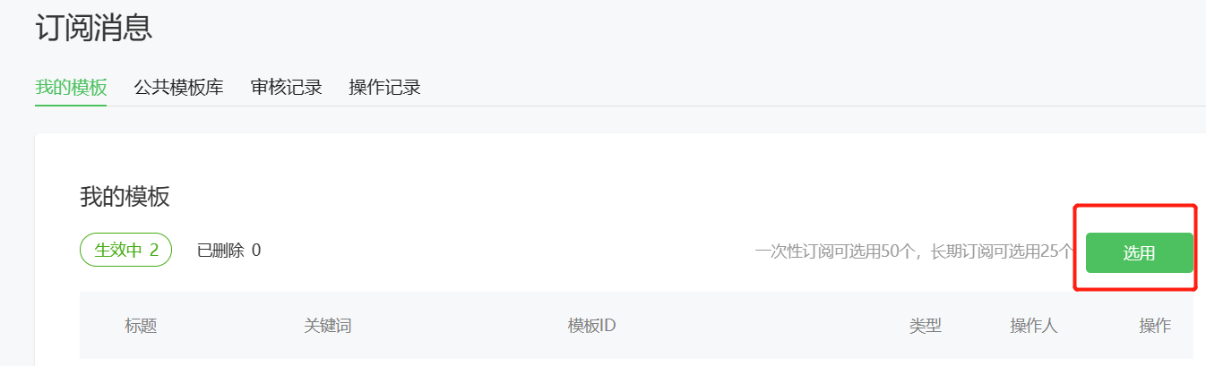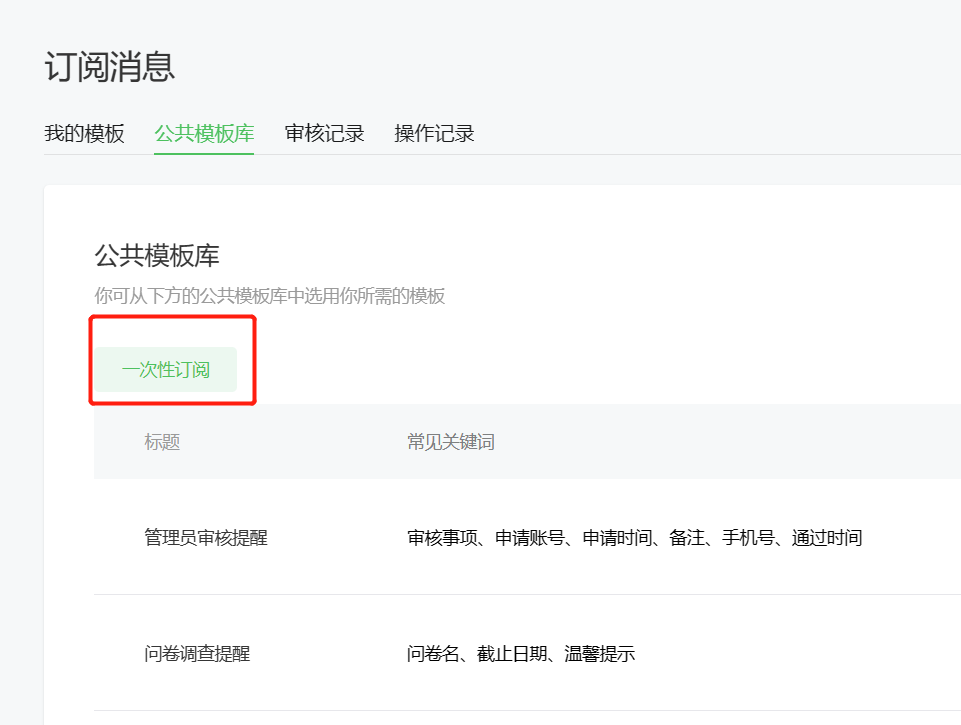 所以我們普通小程序,在注冊成功后,訂閱消息的模板選擇,只有一次性訂閱的選項,沒有長期訂閱的選項。