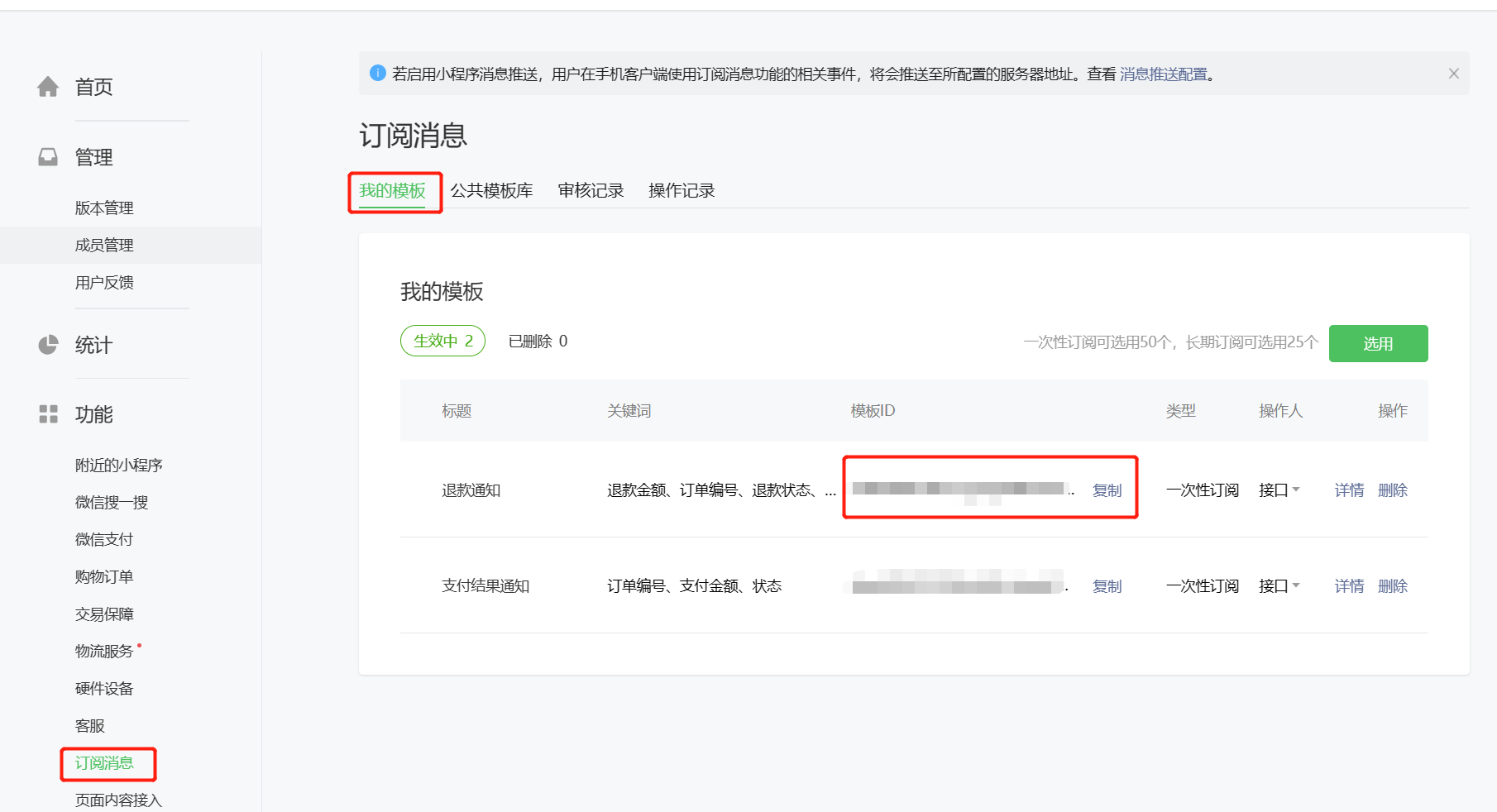 在微信公眾平臺登錄小程序,在訂閱消息功能下,進入到我的模板,找到模板,并將模板id復制出來,如果沒有模板,需要先添加模板,再獲取模板id
