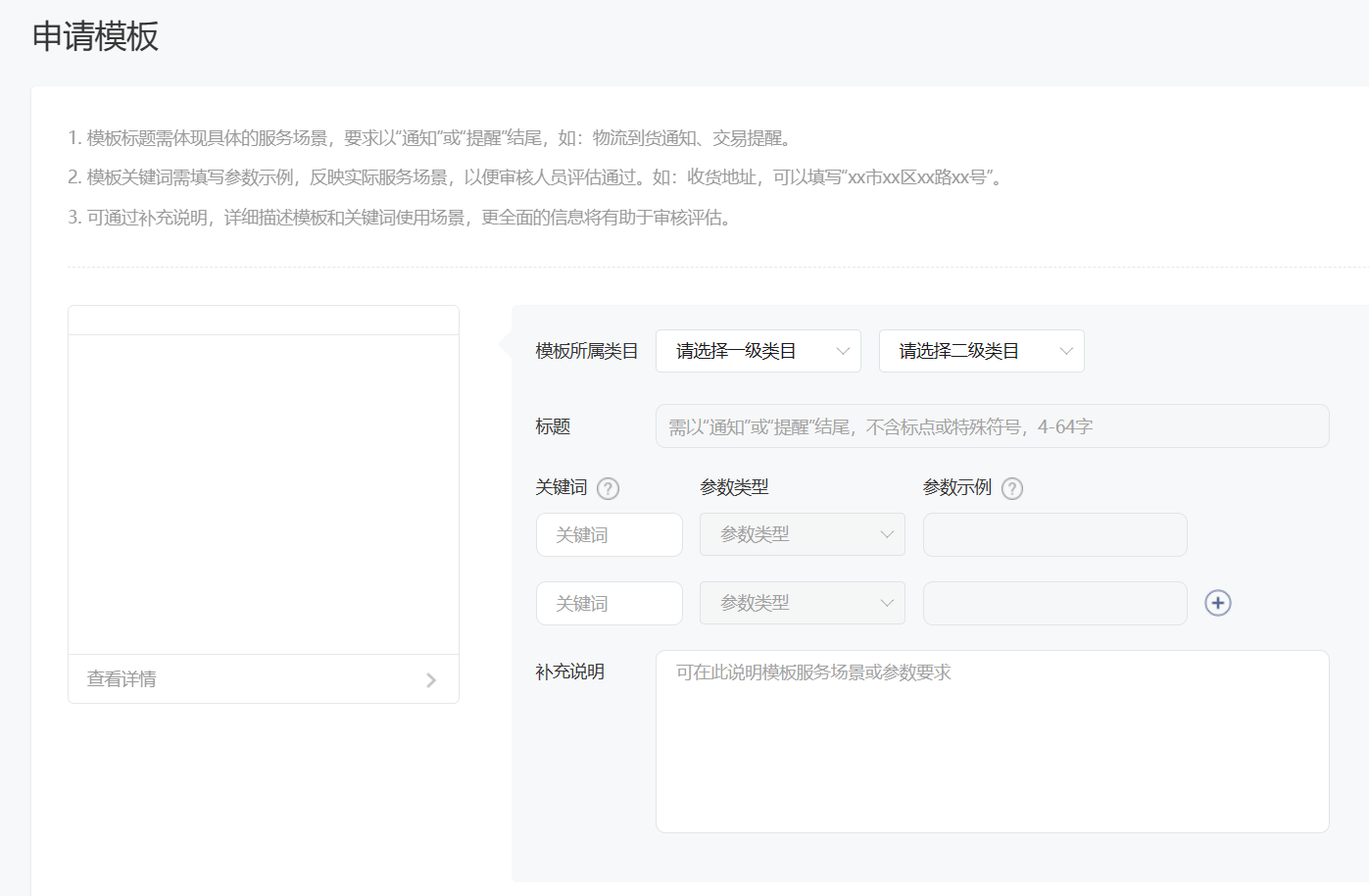 模板標題需體現具體的服務場景,要求以“通知”或“提醒”結尾,如:物流到貨通知、交易提醒。