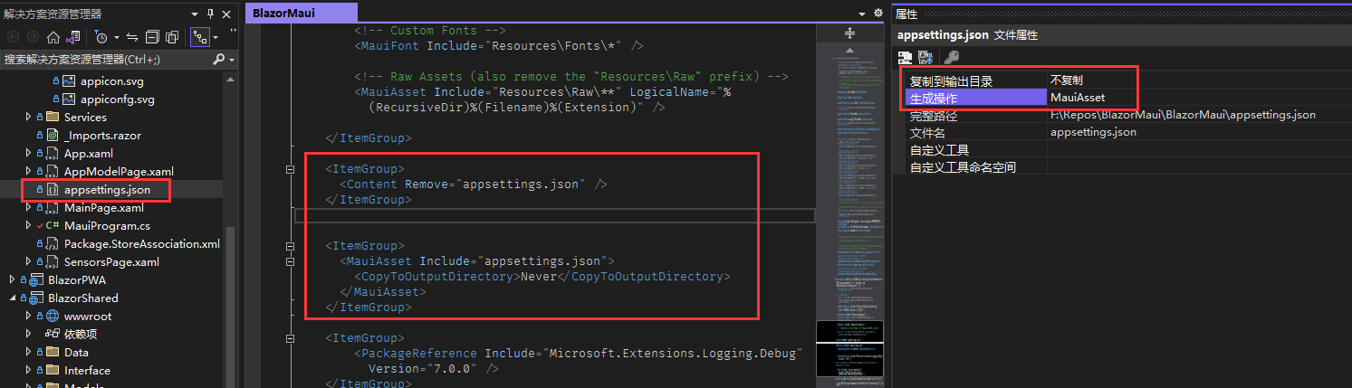 <ItemGroup> <Content Remove="appsettings.json" /> </ItemGroup> <ItemGroup> <MauiAsset Include="appsettings.json"><CopyToOutputDirectory>Never</CopyToOutputDirectory> </MauiAsset> </ItemGroup>