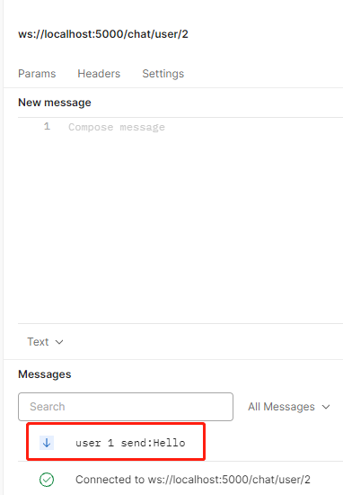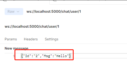 private async Task SubMsg(string channel){ var sub = _redisClient.Subscribe(channel, async (channel, data) => {ChannelMsgBody msgBody = JsonConvert.DeserializeObject<ChannelMsgBody>(data.ToString());byte[] sendByte = Encoding.UTF8.GetBytes($"user {msgBody.FromId} send:{msgBody.Msg}");if (UserConnection.TryGetValue(msgBody.ToId, out var targetSocket)){ if (targetSocket.State == WebSocketState.Open) {await targetSocket.SendAsync(new ArraySegment<byte>(sendByte, 0, sendByte.Length), WebSocketMessageType.Text, true, CancellationToken.None); } else {_ = UserConnection.TryRemove(msgBody.FromId, out _); }} }); //把訂閱實例加入集合 _disposables.TryAdd(channel, sub);}如果給某個用戶發(fā)送消息則可以使用如下的消息格式
