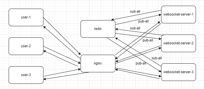 發(fā)送給所有用戶的邏輯比較簡單,不用考慮到用戶限制,只要用戶連接到了WebSocket集群則都可以接收到這個消息,大致工作方式如下圖所示