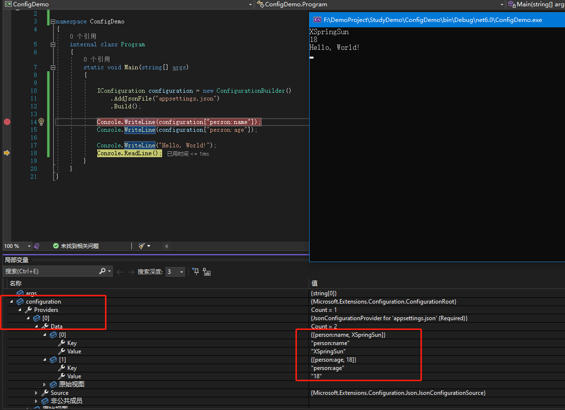 { "person": { "name": "XSpringSun", "age": 18 }}(3). 使用json提供程序讀取json配置new一個ConfigurationBuilder,添加json配置,AddJsonFile是在包中的IConfigurationBuilder擴展方法,其它配置提供程序也是用這種擴展方法實現。