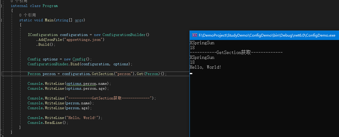 IConfiguration configuration = new ConfigurationBuilder().AddJsonFile("appsettings.json").Build(); Config options = new Config(); ConfigurationBinder.Bind(configuration, options); Person person = configuration.GetSection("person").Get<Person>(); Console.WriteLine(options.person.name); Console.WriteLine(options.person.age); Console.WriteLine("-----------GetSection獲取-------------"); Console.WriteLine(person.name); Console.WriteLine(person.age);