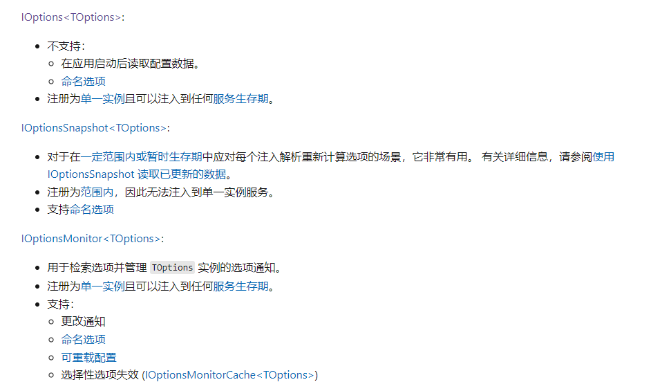 public class TestOptionDI {private readonly IOptionsSnapshot<Config> _options;public TestOptionDI(IOptionsSnapshot<Config> options){ _options = options;}public void Test(){ Console.WriteLine("DI測試輸出:"); Console.WriteLine($"姓名:{_options.Value.person.name}"); Console.WriteLine($"年齡:{_options.Value.person.age}");} }在測試類中我們使用IOptionsSnapshot<T>接口作為依賴注入,還有其它不同定義的接口用來配置注入,關于選項接口:。