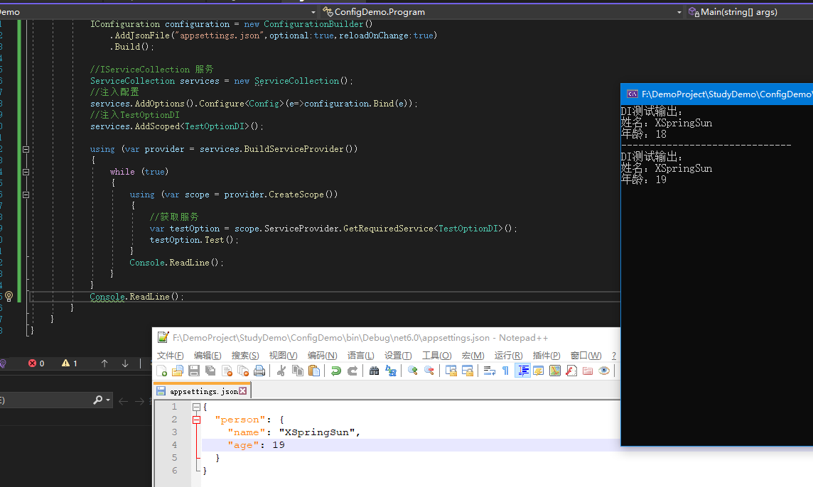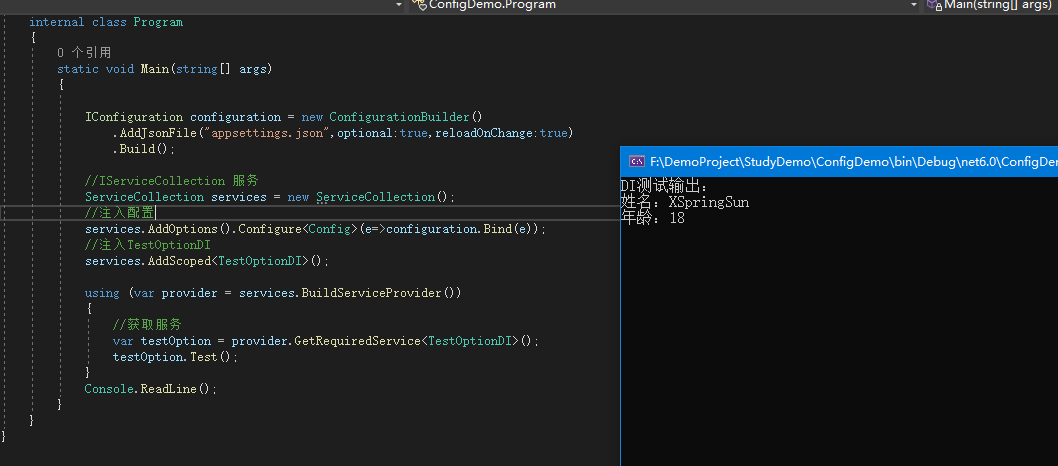 static void Main(string[] args){ IConfiguration configuration = new ConfigurationBuilder().AddJsonFile("appsettings.json",optional:true,reloadOnChange:true).Build(); //IServiceCollection 服務 ServiceCollection services = new ServiceCollection(); //注入配置 services.AddOptions().Configure<Config>(e=>configuration.Bind(e)); //注入TestOptionDI services.AddScoped<TestOptionDI>(); using (var provider = services.BuildServiceProvider()) {//獲取服務var testOption = provider.GetRequiredService<TestOptionDI>();testOption.Test(); } Console.ReadLine();}