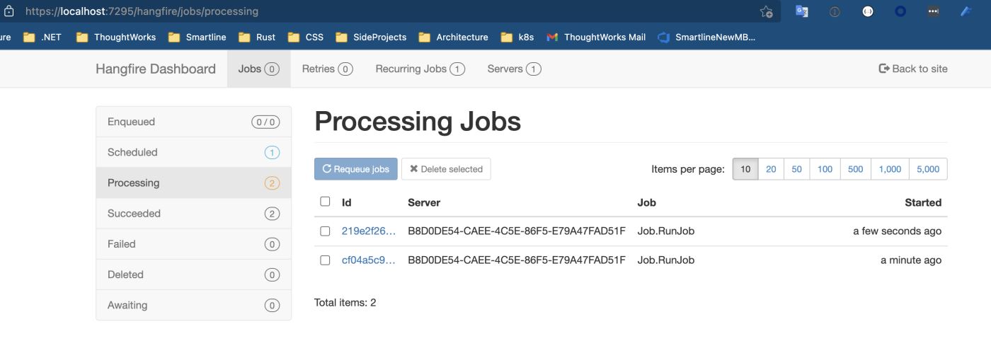 Server b8d0de54-caee-4c5e-86f5-e79a47fad51f is starting the registered dispatchers: ServerWatchdog, ServerJobCancellationWatcher, ExpirationManager, CountersAggregator, Worker, DelayedJobScheduler, RecurringJobScheduler...