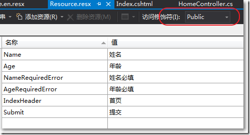創建有關中文的資源文件,并把訪問修飾符設置為public:
