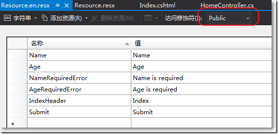 創建有關英文的資源文件,也把訪問修飾符設置為public: