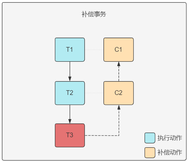 而當執(zhí)行到某個Tj出現(xiàn)故障時,則反向補償之前的Tj-1..T1,每個對應的補償操作Cj-1...C1,其中Tj事務由于在執(zhí)行階段就已失敗,所以Tj對應的補償動作Cj不需要執(zhí)行,即也確定了最后一個Tn事務可以不設(shè)置補償動作Cn。