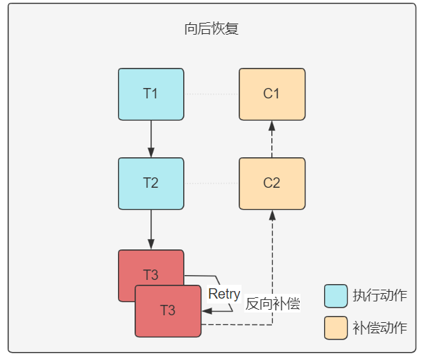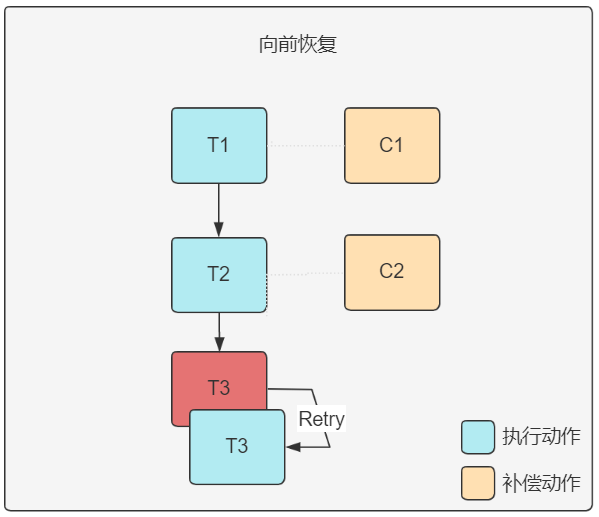 - 向前恢復(forward recovery):對于Ti事務的執(zhí)行,部分場景下可能因為數(shù)據(jù)庫的連接、網(wǎng)絡(luò)的波動等導致短暫的失敗,對Ti事務重試執(zhí)行,以確保整個事務的執(zhí)行,如執(zhí)行T1, T2, T3,當執(zhí)行T3失敗時,不直接宣告失敗,對T3執(zhí)行重試以排除部分不穩(wěn)定因素,如在若干次重試無效后,再考慮向后恢復。
