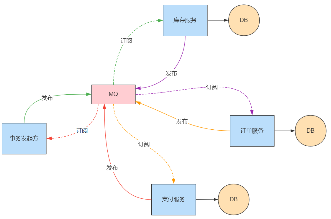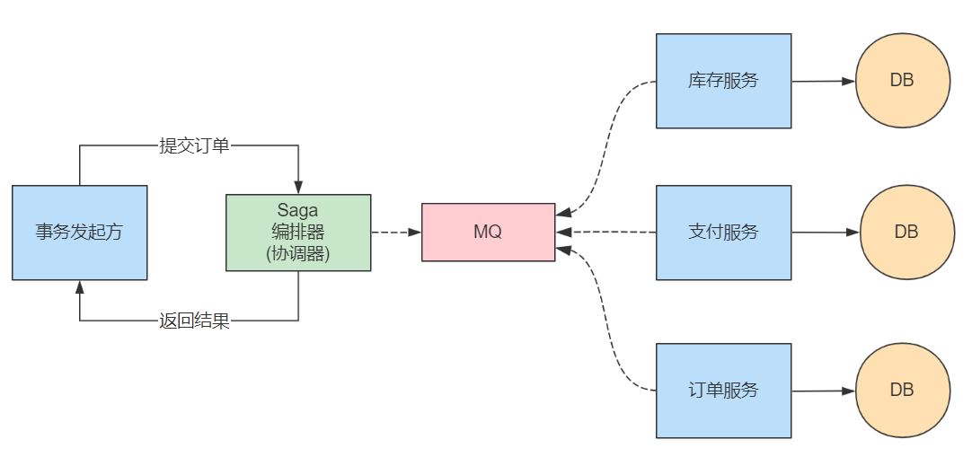 2、Saga編排器類向MQ發(fā)送減庫存事件,庫存服務訂閱事件、執(zhí)行處理并返回MQ處理結(jié)果。