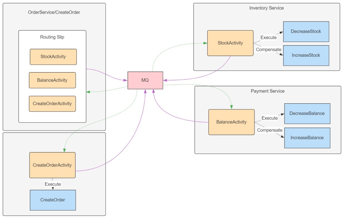 Task BuildRoutingSlip(RoutingSlipBuilder builder, ConsumeContext<createordercommand> request){ builder.AddActivity("ReduceStock", new Uri("..."), new {}); builder.AddActivity("DeductBalance", new Uri("..."), new {}); builder.AddActivity("CreateOrder", new Uri("..."), new { }); return Task.CompletedTask;}執(zhí)行請求
