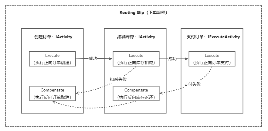 而對于IActivity和RoutingSlip則是MassTransit Courier的核心對象,主要用于實現Saga模式的分布式事務。MassTransit Courier 實現了Routing Slip模式,通過按需有序組合一系列的Activity,得到一個用來限定消息處理順序的Routing Slip。而每個Activity的具體抽象就是IActivity和IExecuteActivity。二者的差別在于IActivity定義了Execute和Compensate兩個方法,而IExecuteActivitiy僅定義了Execute方法。其中Execute代表正向操作,Compensate代表反向補償操作。用一個簡單的下單流程:創建訂單->扣減庫存->支付訂單舉例而言,其示意圖如下所示。而對于具體實現,可參閱文章:AspNetCore&MassTransit Courier實現分布式事務