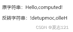 <!DOCTYPE html><html lang="en"><head> <meta charset="UTF-8"> <meta http-equiv="X-UA-Compatible" content="IE=edge"> <meta name="viewport" content="width=device-width, initial-scale=1.0"> <title>Document</title> <script src="../../vue-2.7.14.js"></script></head><body> <div id="root"><p>原字符串:{{msg}}</p><p>反轉(zhuǎn)字符串:{{reverseMsg}}</p> </div> <script>var vm = new Vue({ el: "#root", data: {msg: "Hello,computed!", }, computed: {//計(jì)算屬性的getter函數(shù)reverseMsg: function () { return this.msg.split("").reverse().join("");} }}) </script></body></html>執(zhí)行結(jié)果:
