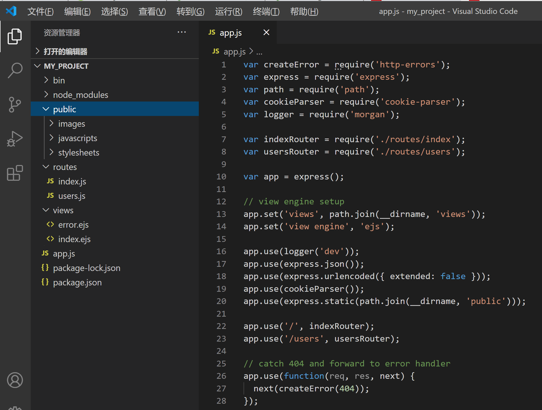 上邊的信息相當(dāng)于是在執(zhí)行npx express-generator --view ejs之后,nodejs給出的一個(gè)回執(zhí)信息,告訴我們創(chuàng)建了哪些文件或目錄(如create : public\等),另外,install dependencies:和 run the app兩句,是告訴我們,這個(gè)系統(tǒng)想要運(yùn)行起來(lái),它還依賴(lài)很多包,需要通過(guò)npm install完成下載安裝;