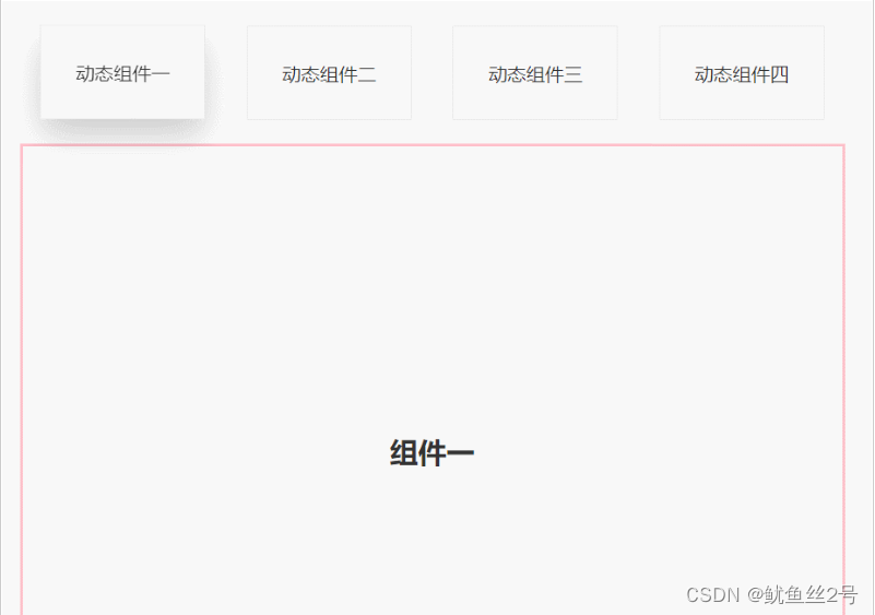 <template> <div id="app"> <div> <div :class="{ highLight: whichIndex == index }"v-for="(item, index) in cardArr":key="index"@click=" whichIndex = index; componentId = item.componentId;" >{{ item.componentName }} </div> </div> <div> <keep-alive><component :is="componentId"></component> </keep-alive> </div> </div></template><script>import one from "./components/one";import two from "./components/two";import three from "./components/three";import four from "./components/four";export default { components: { one, two, three, four, }, data() { return { whichIndex: 0, componentId: "one", cardArr: [{ componentName: "動態組件一", componentId: "one",},{ componentName: "動態組件二", componentId: "two",},{ componentName: "動態組件三", componentId: "three",},{ componentName: "動態組件四", componentId: "four",}, ], }; },};</script><style lang="less" scoped>#app { width: 100%; height: 100vh; box-sizing: border-box; padding: 50px; .top { width: 100%; height: 80px; display: flex; justify-content: space-around; .crad { width: 20%; height: 80px; line-height: 80px; text-align: center; background-color: #fff; border: 1px solid #e9e9e9; } .highLight { box-shadow: 0 15px 30px rgba(0, 0, 0, 0.2); transform: translate3d(0, -1px, 0); } } .bottom { margin-top: 20px; width: 100%; height: calc(100% - 100px); border: 3px solid pink; display: flex; justify-content: center; align-items: center; }}</style>總結