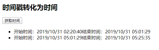 import React from "react";import axios from "axios";import moment from "moment";class Time extends React.Component { //構造函數 constructor() { super(); //react定義數據 this.state = { list: [] } } //請求接口的方法 getData = () => { var api = "http://localhost:3004/users"; axios.get(api) .then((response) => {// handle successconsole.log(response.data);//用到this需要注意指向,箭頭函數this.setState({ list: response.data}) }) .catch(function (error) {// handle errorconsole.log(error); }); } render() { return ( <div><h2>時間戳轉化為時間</h2><button onClick={this.getData}>獲取時間</button><ul> { this.state.list.map((value, key) => { let start = moment(parseInt(value.startTime)).format("YYYY/MM/DD hh:mm:ss"); let end = moment(parseInt(value.endTime)).format("YYYY/MM/DD hh:mm:ss"); return (<li key={key}> <span>開始時間:{start}</span> <span>結束時間:{end}</span></li> ) }) }</ul> </div> ) }}export default Time;5:效果