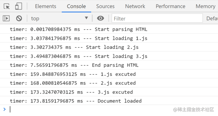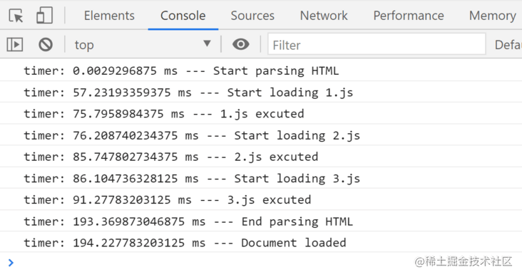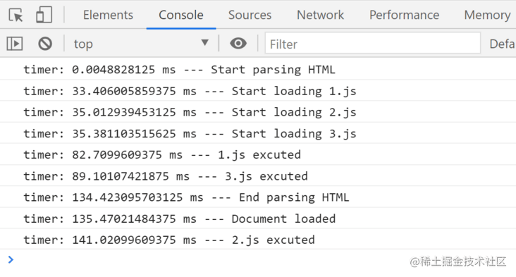 const text3 = ` // 超長(zhǎng)文本`text3.split(" ");console.timeLog("timer", "--- 3.js excuted");我們分別使用普通、async和defer的方式加載1.js、2.js、3.js,觀察控制臺(tái)的打印結(jié)果: