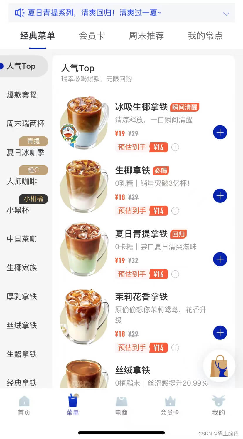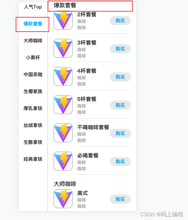 <template> <div><div> <div :class="{ active: currentIndex == index }" v-for="(item, index) in types"@click="changeType(index)">{{ item }} </div></div><div @scroll="handleScroll"> <div v-for="(item, index) in shops" :key="index" ref="shop"><div>{{ item.category }}</div><div v-for="(i, j) in item.data" :key="j"> <div><img src="/vite.svg" /> </div> <div><div>{{ i.name }}</div><div>{{ i.type }}</div><div>{{ i.desc }}</div><div>購買</div> </div></div> </div></div> </div></template><script setup>import { ref, onMounted, onBeforeUnmount, nextTick } from "vue"let isLock = ref(false)// 分類let types = ref([ "人氣Top", "爆款套餐", "大師咖啡", "小黑杯", "中國茶咖", "生椰家族", "厚乳拿鐵", "絲絨拿鐵", "生酪拿鐵", "經典拿鐵",])// 商品let shops = ref([ {category: "人氣Top",data: [ {name: "冰吸生椰拿鐵",type: "咖啡",desc: "咖啡" }, {name: "生椰拿鐵",type: "咖啡",desc: "咖啡" }, {name: "摸魚生椰拿鐵",type: "咖啡",desc: "咖啡" }, {name: "茉莉花香拿鐵",type: "咖啡",desc: "咖啡" }, {name: "絲絨拿鐵",type: "咖啡",desc: "咖啡" }, {name: "小甘橘美式",type: "咖啡",desc: "咖啡" },] }, {category: "爆款套餐",data: [ {name: "2杯套餐",type: "咖啡",desc: "咖啡" }, {name: "3杯套餐",type: "咖啡",desc: "咖啡" }, {name: "4杯套餐",type: "咖啡",desc: "咖啡" }, {name: "5杯套餐",type: "咖啡",desc: "咖啡" }, {name: "不喝咖啡套餐",type: "咖啡",desc: "咖啡" }, {name: "必喝套餐",type: "咖啡",desc: "咖啡" },] }, {category: "大師咖啡",data: [ {name: "美式",type: "咖啡",desc: "咖啡" }, {name: "加濃美式",type: "咖啡",desc: "咖啡" }, {name: "橙C美式",type: "咖啡",desc: "咖啡" }, {name: "澳瑞白",type: "咖啡",desc: "咖啡" }, {name: "卡布奇諾",type: "咖啡",desc: "咖啡" }, {name: "瑪奇朵",type: "咖啡",desc: "咖啡" },] }, {category: "小黑杯",data: [ {name: "云南小柑橘",type: "咖啡",desc: "咖啡" }, {name: "廣東小柑橘",type: "咖啡",desc: "咖啡" }, {name: "廣西小柑橘",type: "咖啡",desc: "咖啡" }, {name: "福建小柑橘",type: "咖啡",desc: "咖啡" }, {name: "湖南小柑橘",type: "咖啡",desc: "咖啡" }, {name: "江西小柑橘",type: "咖啡",desc: "咖啡" },] }, {category: "中國茶咖",data: [ {name: "碧螺知春拿鐵",type: "咖啡",desc: "咖啡" }, {name: "茉莉花香拿鐵",type: "咖啡",desc: "咖啡" }, {name: "菊花香拿鐵",type: "咖啡",desc: "咖啡" }, {name: "梅花香拿鐵",type: "咖啡",desc: "咖啡" }, {name: "蘭花香拿鐵",type: "咖啡",desc: "咖啡" }, {name: "玫瑰花香拿鐵",type: "咖啡",desc: "咖啡" },] }, {category: "生椰家族",data: [ {name: "冰吸生椰拿鐵",type: "咖啡",desc: "咖啡" }, {name: "生椰拿鐵",type: "咖啡",desc: "咖啡" }, {name: "摸魚生椰拿鐵",type: "咖啡",desc: "咖啡" }, {name: "椰云拿鐵",type: "咖啡",desc: "咖啡" }, {name: "絲絨拿鐵",type: "咖啡",desc: "咖啡" }, {name: "隕石拿鐵",type: "咖啡",desc: "咖啡" },] }, {category: "厚乳拿鐵",data: [ {name: "厚乳拿鐵",type: "咖啡",desc: "咖啡" }, {name: "生椰拿鐵",type: "咖啡",desc: "咖啡" }, {name: "茉莉花香拿鐵",type: "咖啡",desc: "咖啡" }, {name: "椰云拿鐵",type: "咖啡",desc: "咖啡" }, {name: "絲絨拿鐵",type: "咖啡",desc: "咖啡" }, {name: "海鹽拿鐵",type: "咖啡",desc: "咖啡" },] }, {category: "絲絨拿鐵",data: [ {name: "絲絨拿鐵",type: "咖啡",desc: "咖啡" }, {name: "生椰絲絨拿鐵",type: "咖啡",desc: "咖啡" }, {name: "黑糖絲絨拿鐵",type: "咖啡",desc: "咖啡" }, {name: "椰云絲絨拿鐵",type: "咖啡",desc: "咖啡" }, {name: "香草絲絨拿鐵",type: "咖啡",desc: "咖啡" }] }, {category: "生酪拿鐵",data: [ {name: "生酪拿鐵",type: "咖啡",desc: "咖啡" }, {name: "綠豆拿鐵",type: "咖啡",desc: "咖啡" }, {name: "紅豆拿鐵",type: "咖啡",desc: "咖啡" }, {name: "黑豆拿鐵",type: "咖啡",desc: "咖啡" }, {name: "黃豆拿鐵",type: "咖啡",desc: "咖啡" }] }, {category: "經典拿鐵",data: [ {name: "拿鐵",type: "咖啡",desc: "咖啡" }, {name: "隕石拿鐵",type: "咖啡",desc: "咖啡" }, {name: "焦糖拿鐵",type: "咖啡",desc: "咖啡" }, {name: "生椰拿鐵",type: "咖啡",desc: "咖啡" }, {name: "美式",type: "咖啡",desc: "咖啡" }] },])// 獲取右側商品的ref實例let shop = ref(null)// 用來表示當前選中處于激活狀態的分類的索引let currentIndex = ref(0)// 切換類型const changeType = val => { currentIndex.value = val // 獲取選中的dom元素 const typeItemDom = shop.value[val] // 開鎖 isLock.value = true // 第一個參數為水平方向,第二個參數為縱軸方向 window.scrollTo(0, typeItemDom.offsetTop) setTimeout(() => {//關鎖isLock.value = false }, 0)}// 監聽頁面滾動const handleScroll = () => { // 鎖關了滾動事件才有效 if (!isLock.value) {types.value.forEach((item, index) => { // console.dir(shop.value[index]); const shopItemDom = shop.value[index] // 每個模塊距離頂部的距離 const offsetTop = shopItemDom.offsetTop // 頁面滾動的距離 const scrollTop = document.documentElement.scrollTop if (scrollTop >= offsetTop) {// 給左邊分類設置激活的效果currentIndex.value = index }}) }}onMounted(() => { window.addEventListener("scroll", handleScroll);})onBeforeUnmount(() => { window.removeEventListener("scroll", handleScroll);})</script><style scoped lang="less">.classify { display: flex; position: relative; .left {display: flex;flex-direction: column;align-items: center;position: fixed;left: 0;top: 0;bottom: 0;width: 92px;overflow-y: scroll;border-right: 1px solid #C1C2C4;.item { display: flex; justify-content: center; align-items: center; width: 67px; height: 29px; font-size: 15px; font-family: PingFang SC-Semibold, PingFang SC; font-weight: 600; color: #333333;}.active { color: #00B1FF;}.item:not(:last-child) { margin-bottom: 25px;} } .right {flex: 1;posit