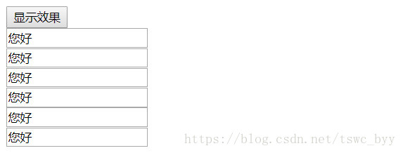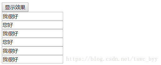 <body><input type="button" value="顯示效果" id="btn"/><br/><input type="text" value="您好" name="name1"/><br/><input type="text" value="您好" name="name2"/><br/><input type="text" value="您好" name="name1"/><br/><input type="text" value="您好" name="name3"/><br/><input type="text" value="您好" name="name1"/><br/><input type="text" value="您好" name="name1"/><br/><script> //點(diǎn)擊按鈕,改變所有name屬性值為name1的文本框中的value屬性值 document.getElementById("btn").onclick = function () {//通過name屬性值獲取元素-------表單的標(biāo)簽var inputs = document.getElementsByName("name1");for (var i = 0; i < inputs.length; i++) { inputs[i].value = "我很好";} };</script></body>