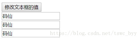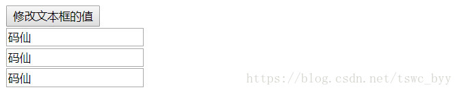<body><input type="button" value="修改文本框的值" id="btn"/><br/><input type="text" value=""/><br/><input type="text" value=""/><br/><input type="text" value=""/><script> document.getElementById("btn").onclick = function () {//根據(jù)選擇器的方式獲取元素var inputs = document.querySelectorAll(".text");for (var i = 0; i < inputs.length; i++) { inputs[i].value = "碼仙";} };</script></body>