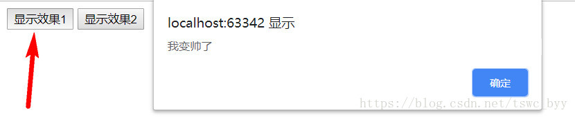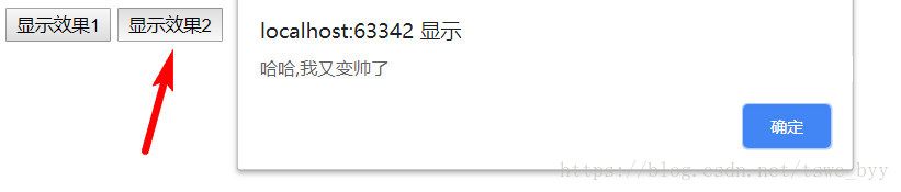<body><input type="button" value="顯示效果1" id="btn"/><input type="button" value="顯示效果2"/><script> //點(diǎn)擊按鈕彈出對話框 //根據(jù)選擇器的方式獲取元素 var btnObj1 = document.querySelector("#btn"); btnObj1.onclick = function () {alert("我變帥了"); }; var btnObj2 = document.querySelector(".btn"); btnObj2.onclick = function () {alert("哈哈,我又變帥了"); };</script></body>