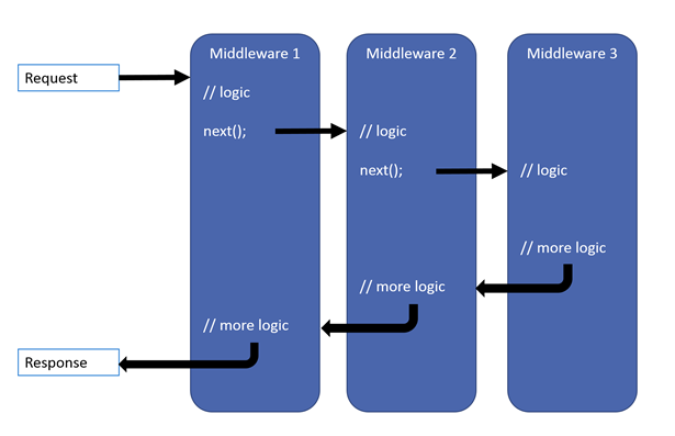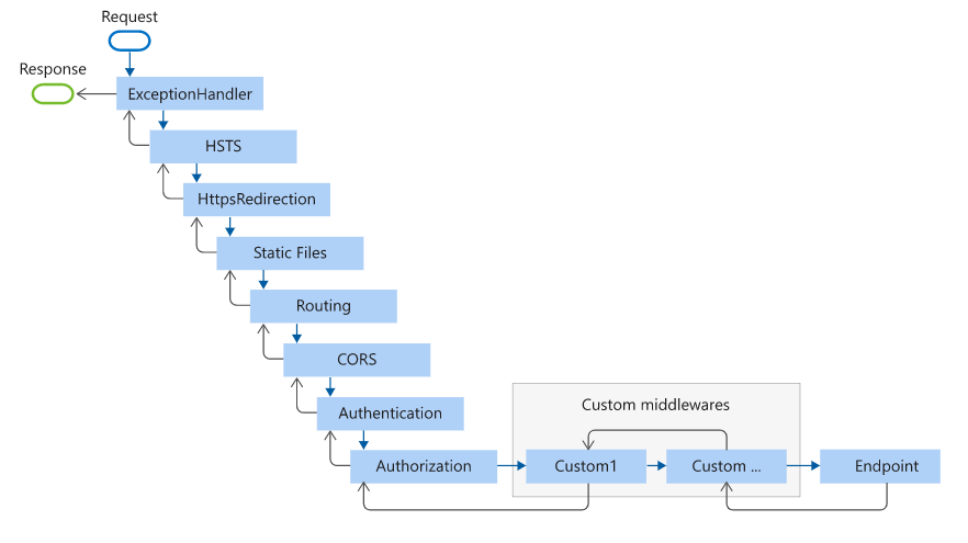 中間件的執行與調用的順序有關,在響應式以相反的順序返回。請求在每一步都有可能短路,所以需要正確的添加中間件,如異常處理的中間件,需要放在請求管道的前面,這樣就可以一開始捕獲異常,以及后面中間件中可能發生的異常,做出返回處理。