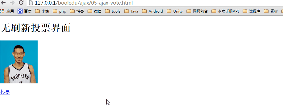 <!DOCTYPE html><html><head> <meta charset="utf-8"> <meta http-equiv="X-UA-Compatible" content="IE=edge"> <title>無刷新投票界面</title> <link rel="stylesheet" href=""></head><script> //創建XMLHttpRequest對象 function createXhr(){ var xhr = null; if(window.XMLHttpRequest){ xhr = new XMLHttpRequest();//谷歌、火狐等瀏覽器 }else if(window.ActiveXObject){ xhr = new ActiveXObject("Microsoft.XMLHTTP");//ie低版本 } return xhr; } //ajax投票 function vote(){ //1、創建xhr對象 var xhr = createXhr(); //2、確定請求方法、路徑、請求方式為異步 xhr.open("GET","./05-ajax-vote.php",true); //3、發送請求 xhr.send(null); //4、異步方式設置回調 xhr.onreadystatechange = function(){ //如果準備狀態為4,表示執行結束 if(this.readyState == 4){//根據服務端返回的標識來提示用戶投票是否成功if(xhr.responseText == "1"){ alert("投票成功");}else{ alert("投票失敗");} } } }</script><body> <h1>無刷新投票界面</h1> <img src="./lin.jpg"/> <p> <a href="javascript:void(0);" rel="external nofollow" onclick="vote();">投票</a> </p></body></html>05-ajax-vote.php文件: