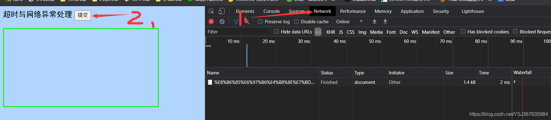 <!DOCTYPE html><html lang="en"><head> <meta charset="UTF-8" /> <titile>超時與網絡異常處理</titile> <style>#content { width: 400px; height: 200px; border: 1px solid rgb(4, 247, 25); border-width: 3px; margin: 20px 0 20px 0;} </style></head><body> <button type="button">提交</button> <div id="content"></div> <script>const btn = document.getElementsByTagName("button")[0];const res = document.getElementById("content");btn.onclick = function() { const xhr = new XMLHttpRequest(); xhr.timeout = 2000; xhr.ontimeout = function() {alert("請求超時,請檢查網絡是否可用!"); } xhr.onerror = function() {alert("你的網絡開小差了,請重新連接網絡試試"); } xhr.open("GET", "http://127.0.0.1:8080/delay"); xhr.send(); xhr.onreadystatechange = function() {if (xhr.readyState === 4) { if (xhr.status >= 200 && xhr.status < 300) {res.innerHTML = xhr.response; }} else {} }}; </script></body></html>const express = require("express");const app = express();// 模擬請求超時app.all("/delay", (request, response) => { response.setHeader("Access-Control-Allow-Origin", "*"); response.setHeader("Access-Control-Allow-Headers", "*"); setTimeout(() => {response.send("接收成功:模擬請求超時"); }, 3000);})app.listen(8080, () => { console.log("正在監聽8080端口");});總結