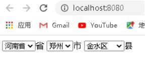 <%@ page contentType="text/html;charset=UTF-8" language="java" %><html><head> <title>三級聯動</title> <script type="text/javascript" src="js/jquery-1.8.3.js"></script></head><body><script type="text/javascript"> $(function () { $.ajax({ type:"get", url:"findAll", dataType:"json", success:function (data) { var obj=$("#province"); for(var i=0;i<data.length;i++){ var ob="<option value=""+data[i].pid+"">"+data[i].pname+"</option>"; obj.append(ob); } } }) $("#province").change(function () { $("#city option").remove(); $.ajax({ type:"get", async:false, url:"findCityByPid?pid="+$("#province").val(), dataType:"json", success:function (data) { var obj=$("#city"); for(var i=0;i<data.length;i++){ var ob="<option value=""+data[i].cid+"">"+data[i].cname+"</option>"; obj.append(ob); } } }) }); $("#city,#province").change(function () { $("#area option").remove(); $.ajax({ type:"get", async:false, url:"findAreaByCid?cid="+$("#city").val(), dataType:"json", success:function (data) { var obj=$("#area"); for(var i=0;i<data.length;i++){ var ob="<option value=""+data[i].aid+"">"+data[i].aname+"</option>"; obj.append(ob); } } }) }); });</script><select name="province" id="province"> <option value="0">請選擇</option></select>省<select name="city" id="city"> <option value="0">請選擇</option></select>市<select name="area" id="area"> <option value="0">請選擇</option></select>縣</body></html>實現結果如下:
