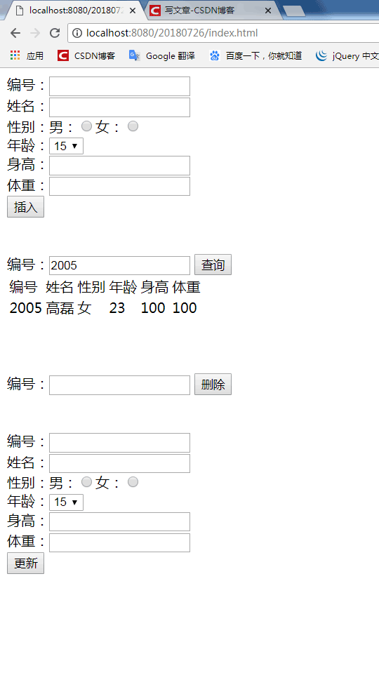 <!DOCTYPE html><html> <head> <meta charset="UTF-8"> <title></title> <script src="http://libs.baidu.com/jquery/2.1.4/jquery.min.js"></script> </head> <body> 編號:<input type="text" value="" id="pno"/><br> 姓名:<input type="text" value="" id="name"/><br> 性別:男:<input type="radio" name="sex" value="男">女:<input type="radio" name="sex" value="女"><br> 年齡:<select id="age"> <option value="15">15</option> <option value="16">16</option> <option value="17">17</option> <option value="18">18</option> <option value="19">19</option> <option value="20">20</option> <option value="21">21</option> <option value="22">22</option> <option value="23">23</option> <option value="24">24</option> <option value="25">25</option> </select><br> 身高:<input type="text" value="" id="height"/><br> 體重:<input type="text" value="" id="weight"/><br> <input type="button" value="插入" id="btn_1" onclick="submit()"/> <br> <br> <br> 編號:<input type="text" value="" id="pno_query"/> <input type="button" value="查詢" id="btn_2" onclick="query()"/> <table id="queryResult"> <tr> <td>編號</td> <td>姓名</td> <td>性別</td> <td>年齡</td> <td>身高</td> <td>體重</td> </tr> <tr> <td></td> <td></td> <td></td> <td></td> <td></td> <td></td> </tr> </table> <br> <br> <br> 編號:<input type="text" value="" id="pno_del"/> <input type="button" value="刪除" id="btn_3" onclick="del()"/> <br> <br> <br> 編號:<input type="text" value="" id="pno_up"/><br> 姓名:<input type="text" value="" id="name_up"/><br> 性別:男:<input type="radio" name="sex_up" value="男">女:<input type="radio" name="sex_up" value="女"><br> 年齡:<select id="age_up"> <option value="15">15</option> <option value="16">16</option> <option value="17">17</option> <option value="18">18</option> <option value="19">19</option> <option value="20">20</option> <option value="21">21</option> <option value="22">22</option> <option value="23">23</option> <option value="24">24</option> <option value="25">25</option> </select><br> 身高:<input type="text" value="" id="height_up"/><br> 體重:<input type="text" value="" id="weight_up"/><br> <input type="button" value="更新" id="btn_4" onclick="update()"/> </body> <script type="text/javascript"> /* var x = $("#queryResult").html(); for(var i=0; i < 20 ; i++) { x += "<tr><td></td><td></td><td></td><td></td><td></td><td></td></tr>"; } $("#queryResult").html(x);*/ function submit() { var pno = $("#pno").val(); var name = $("#name").val(); var sex = $("input[name="sex"]:checked").val(); var age = $("#age").val(); var height = $("#height").val(); var weight = $("#weight").val(); var data={ "pno":pno, "name":name, "sex":sex, "age":age, "height":height, "weight" : weight } $.ajax({ type : "post", url : "Hello", data : data, cache : true, async : true, success: function (data ,textStatus, jqXHR){ if(data.code == 200){ alert("插入成功了"); }else{ alert(data.message); } }, error:function (XMLHttpRequest, textStatus, errorThrown) { alert(typeof(errorThrown)); } }); } function query() { var pno = $("#pno_query").val(); var str = ["編號","姓名","性別","年齡","身高","體重"]; $.ajax({ type : "post", url : "HelloQuery", data : { "pno": pno }, cache : true, async : true, success: function (data ,textStatus, jqXHR){ //data = $.parseJSON(data); var j = 0; var x = 1; //for(var i=1; i <20; i++) { for(var p in data){//遍歷json對象的每個key/value對,p為key console.log(data[p]); if(j == 6) { j = 0; x++; } $("#queryResult tr:eq("+x+") td:eq("+j+")").html(data[p]); console.log(data[p]); j++; } //} }, error:function (XMLHttpRequest, textStatus, errorThrown) { alert(typeof(errorThrown)); } }); } function del() { var pno = $("#pno_del").val(); $.ajax({ type : "post", url : "HelloDelete", data : { "pno": pno }, cache : true, async : true, success: function (data ,textStatus, jqXHR){ if(data.code == 200){ alert("刪除成功了"); }else{ alert(data.message); } }, error:function (XMLHttpRequest, textStatus, errorThrown) { alert(typeof(errorThrown)); } }); } function update() { var pno = $("#pno_up").val(); var name = $("#name_up").val(); var sex = $("input[name="sex_up"]:checked").val(); var age = $("#age_up").val(); var height = $("#height_up").val(); var weight = $("#weight_up").val(); var data={ "pno":pno, "name":name, "sex":sex, "age":age, "height":height, "weight" : weight } $.ajax({ type : "post", url : "HelloUpdate", data : data, cache : true, async : true, success: function (data ,textStatus, jqXHR){ if(data.code == 200){ alert("更新成功了"); }else{ alert(data.message); } }, error:function (XMLHttpRequest, textStatus, errorThrown) { alert(typeof(errorThrown)); } }); } </script></html>增加的Serlvet:Hello.java
