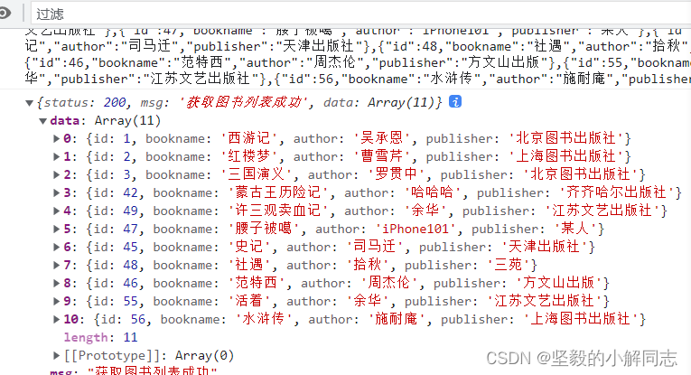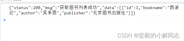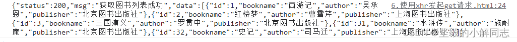 var xhr = new XMLHttpRequest();xhr.open("get", "http://www.liulongbin.top:3006/api/getbooks");xhr.send();xhr.onreadystatechange = function () { if (xhr.readyState === 4 && xhr.status === 200) {console.log(xhr.responseText);var restr = JSON.parse(xhr.responseText)console.log(restr); }}