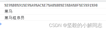 let str = "黑馬程序員";let str2 = encodeURI(str)console.log(str2);//utf-8一個漢字占三個字節(jié) ,寫六個是黑馬兩個字。let str3 = decodeURI("%E9%BB%91%E9%A9%AC")let str4 = decodeURI(str2)console.log(str3);console.log(str4);