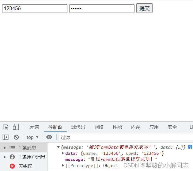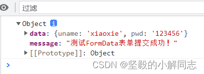 let fd = new FormData();fd.append("uname", "xiaoxie")fd.append("pwd", 123456)let xhr = new XMLHttpRequest();xhr.open("post", "http://www.liulongbin.top:3006/api/formdata")xhr.send(fd);xhr.onreadystatechange = function () { if (xhr.readyState === 4 && xhr.status == 200) {console.log(JSON.parse(xhr.responseText)); }}