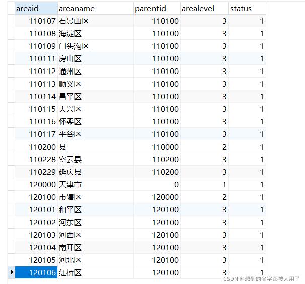 該表包括了中國所有的省、市、縣、區(qū),它們之間通過parentid關聯(lián)。
