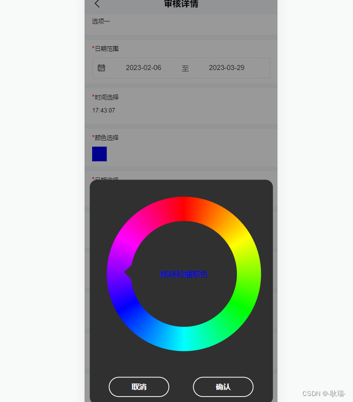 <template> <view> <view> <view id="colorBg" @touchstart="startTouch" @touchmove="moveIng" @touchend="endTouch"> <view :catchtouchmove="true" @c.stop="()=>{}" :style=""transform:rotate(" +degrees +"deg)""></view> <view :style=""color:"+getColorByDeg(this.degrees)">拖轉輪播取色</view> </view> <view> <button @click.stop = "close" type="default">取消</button> <button @click.stop = "readColor" type="default">確認</button> </view> </view> </view></template><script> export default { data() { return { pointerShow: true, colorPanWidth: 20, colorPanRadius: 0, pointerBox: {}, degrees: 0 } }, mounted() { uni.getSystemInfo({ success: (res) => { uni.createSelectorQuery().select("#colorBg").boundingClientRect((rect) => { this.pointerBox = rect }).exec() this.colorPanRadius = res.screenWidth * 0.4 } }) }, methods: { close(){this.$emit("close"); }, readColor(){ let colro = this.getColorByDeg(this.degrees); this.$emit("change",colro); }, rbg2Hex(r, g, b) {return "#" + ((1 << 24) + (r << 16) + (g << 8) + b).toString(16).slice(1); }, calculationScheme(deg) { deg = 360- deg + 120 const r = Math.round(Math.sin((deg * 2 * Math.PI) / 360) * 255) const g = Math.round(Math.sin(((deg + 120) * 2 * Math.PI) / 360) * 255) const b = Math.round(Math.sin(((deg + 240) * 2 * Math.PI) / 360) * 255) return this.colorRgbToHex(`rgb(${r},${g},${b})`); }, startTouch(e) { const { pageX, pageY } = e.touches[0] this.rotatePointer(pageX, pageY) }, endTouch(e) { const { pageX, pageY } = e.changedTouches[0] this.rotatePointer(pageX, pageY) }, moveIng(e) { const { pageX, pageY } = e.touches[0] this.rotatePointer(pageX, pageY) }, rotatePointer(pageX = 0, pageY = 0) { const { pointerBox, colorPanWidth } = this const mouseX = pageX - colorPanWidth const mouseY = pageY - colorPanWidth var centerY = pointerBox.top + (pointerBox.height / 2) - 0, centerX = pointerBox.left + (pointerBox.height / 2) - 0, radians = Math.atan2(mouseX - centerX, mouseY - centerY) this.degrees = (radians * (180 / Math.PI) * -1) + 180; }, getColorByDeg(deg) { deg = 360- deg + 120 const r = Math.round(Math.sin((deg * 2 * Math.PI) / 360) * 255) const g = Math.round(Math.sin(((deg + 120) * 2 * Math.PI) / 360) * 255) const b = Math.round(Math.sin(((deg + 240) * 2 * Math.PI) / 360) * 255) return `rgb(${r},${g},${b})` }, colorRgbToHex(rgbStr) { const reg = /^#([0-9a-fA-f]{3}|[0-9a-fA-f]{6}|[0-9a-fA-f]{8}|[0-9a-fA-f]{6}[0-9]{2})$/; if (reg.test(rgbStr)) { return rgbStr } else { const rgbArray = rgbStr.replace(/(?:\(|\)|rgba|rgb|RGBA|RGB)*/g, "").split(","); let strHex = "#"; for (let i = 0; i < rgbArray.length; i++) { if (i !== 3) { if (rgbArray[i] == "0") { strHex += "00" } else { let newItem =Number(rgbArray[i]).toString(16) if (newItem.length < 2){ newItem = "0" + newItem } strHex += newItem } } else { strHex += rgbArray[i] == "0" ? "" : Number(rgbArray[i]) * 100 } } return strHex; } } } }</script><style> .dialog { display: block; border-radius: 30rpx; background-color: #303030; margin: 20rpx; padding: 30rpx; } .flex { display: flex; justify-content: space-between; } .colorBg { width: 80vw; height: 80vw; margin: 5vw; background: conic-gradient(red, yellow, lime, aqua, blue, fuchsia, red); border-radius: 50%; position: relative; display: flex; justify-content: center; align-items: center; } .roundBuff { width: 55vw; height: 55vw; -webkit-transform-origin: center 50%; transform-origin: center 50%; background: #303030; border-radius: 50%; } .roundBuff::before { content: ""; width: 15px; height: 15px; background: #303030; border: solid #303030; border-width: 10px 10px 0 0; transform: translate(-50%, -50%) rotate(-45deg); position: absolute; left: 50%; top: 2%;} .lee_btn { background: #00000000; color: #FFFFFF; width: 36%; height: 80rpx; line-height: 70rpx; text-align: center; justify-content: center; font-size: 30rpx; border-radius: 50rpx; border: 5rpx #FFFFFF solid; font-weight: bold; padding: 1px 20px; } .colorPan { position: absolute; color: #FFFFFF; }</style>直接將整個組件復制過去 接口使用